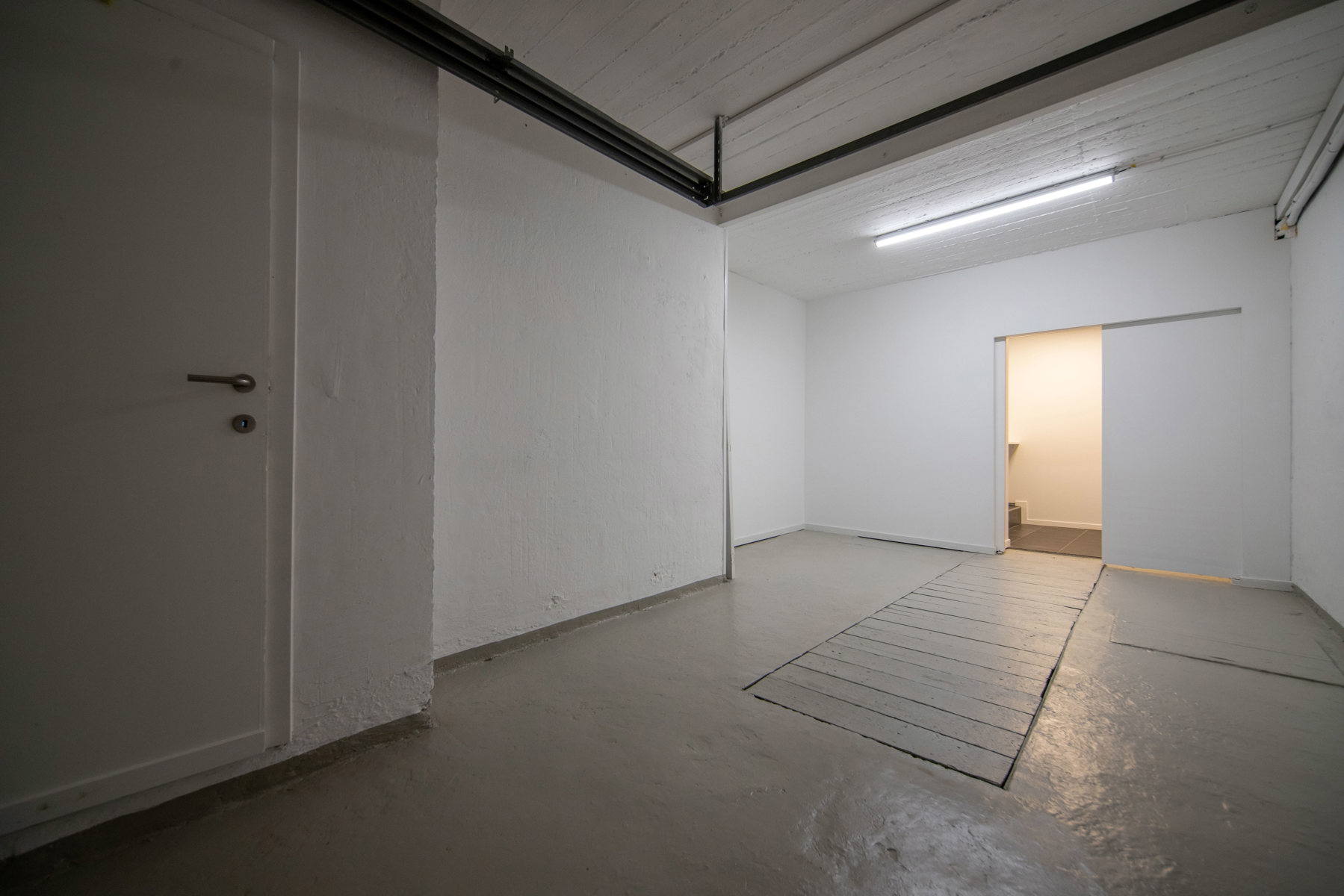 Als we binnen gaan hebben we de garage met kruipruimte en achterliggende berging. Hier is de aansluiting voorzien voor de wasmachine en de droogkast.