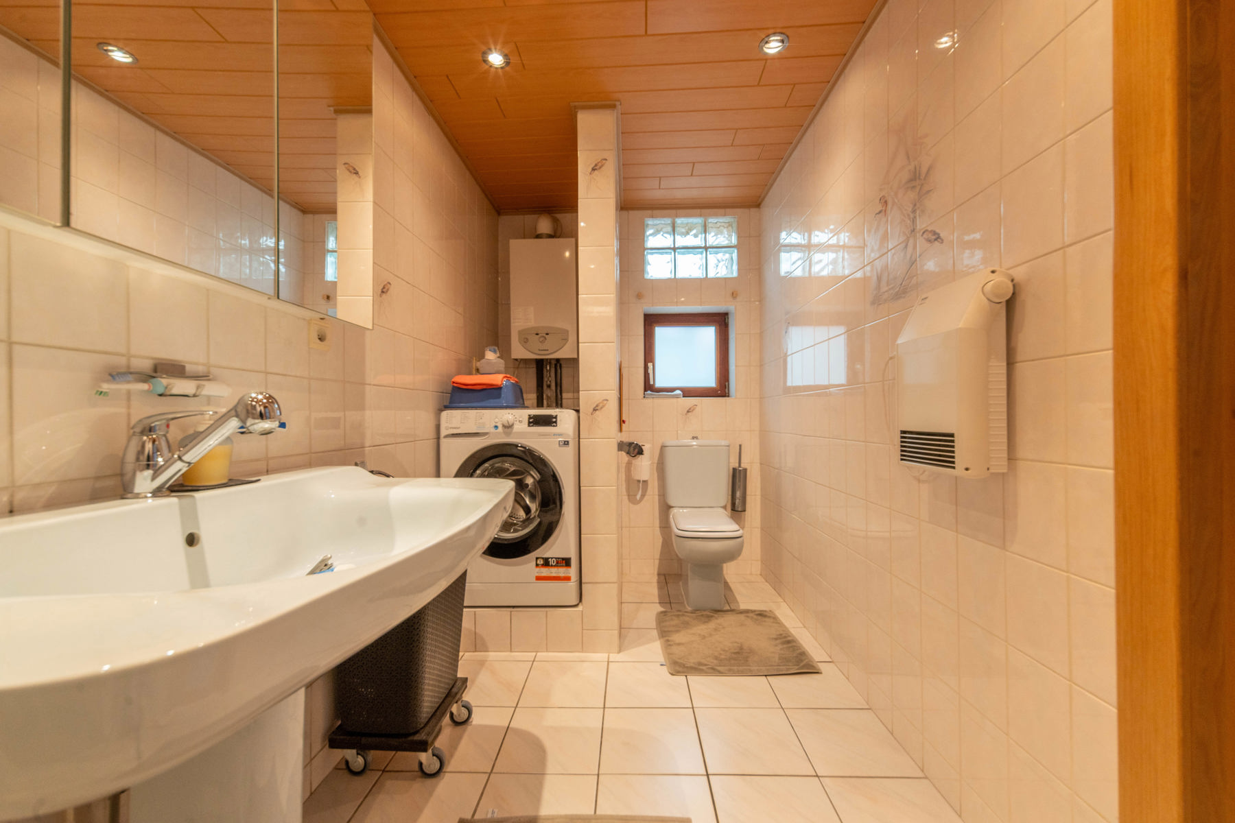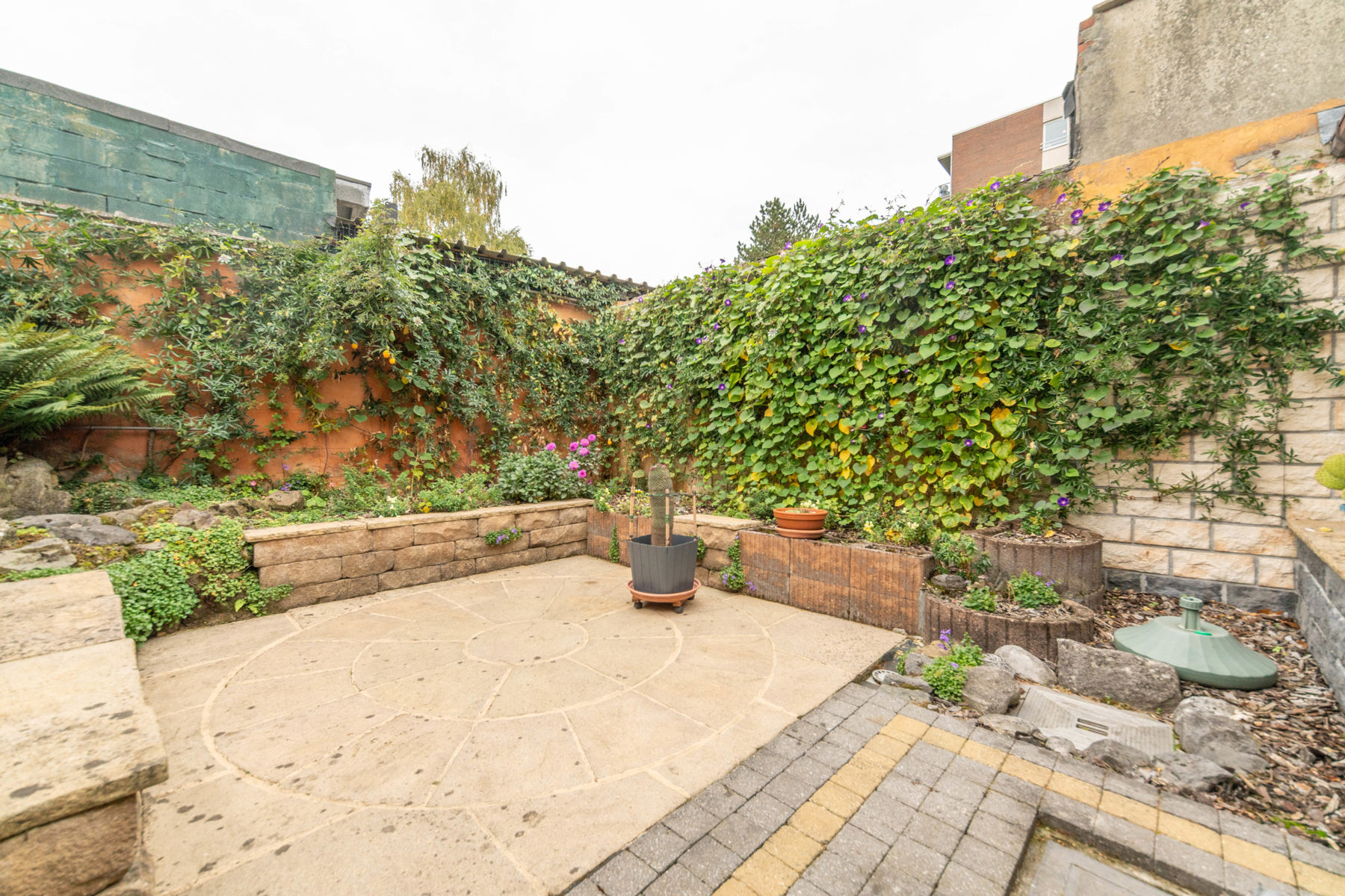 GLV: inkom met trappenhal, leefruimte met verhoogde zithoek (rolluik elektrisch), keuken, droge kelder voor stockage, badkamer met douche en voorzieningen voor droogkast en wasmachine, veranda en gezellige mooi onderhouden stadstuin.